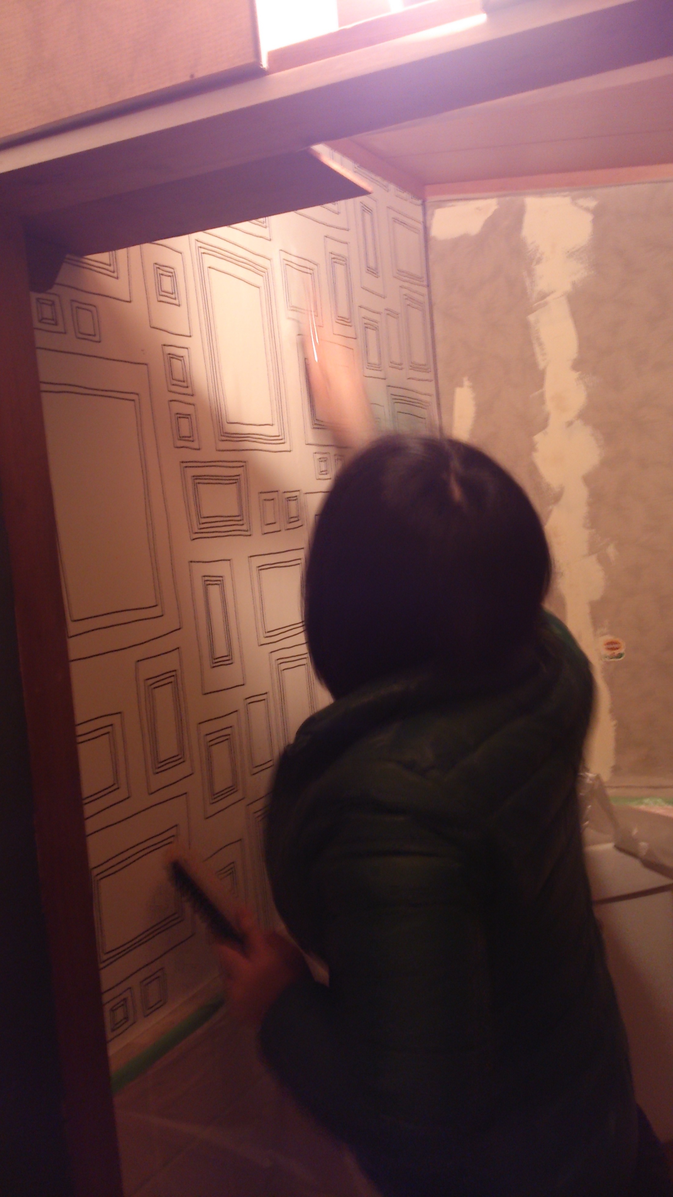 そして5分待ちます。壁紙が水分を吸って引っ張るとすぐに破れそうな感じですが、ゆっくり一枚づつ貼っていきます。